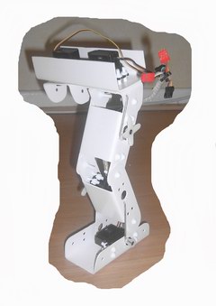 The choice for motorising the legs was not so difficult. It had to be the servos used in radio control toys. These can be positioned quite precisely, have a rotation of about 180 degrees and can be controlled directly from a microprocessor with no worries about position feedback. As it happened I had many of these around as I am a fan of R/C cars. If they're sought new, they can be obtained readily on eBay. At the time of writing, £12 would readily buy you FOUR!